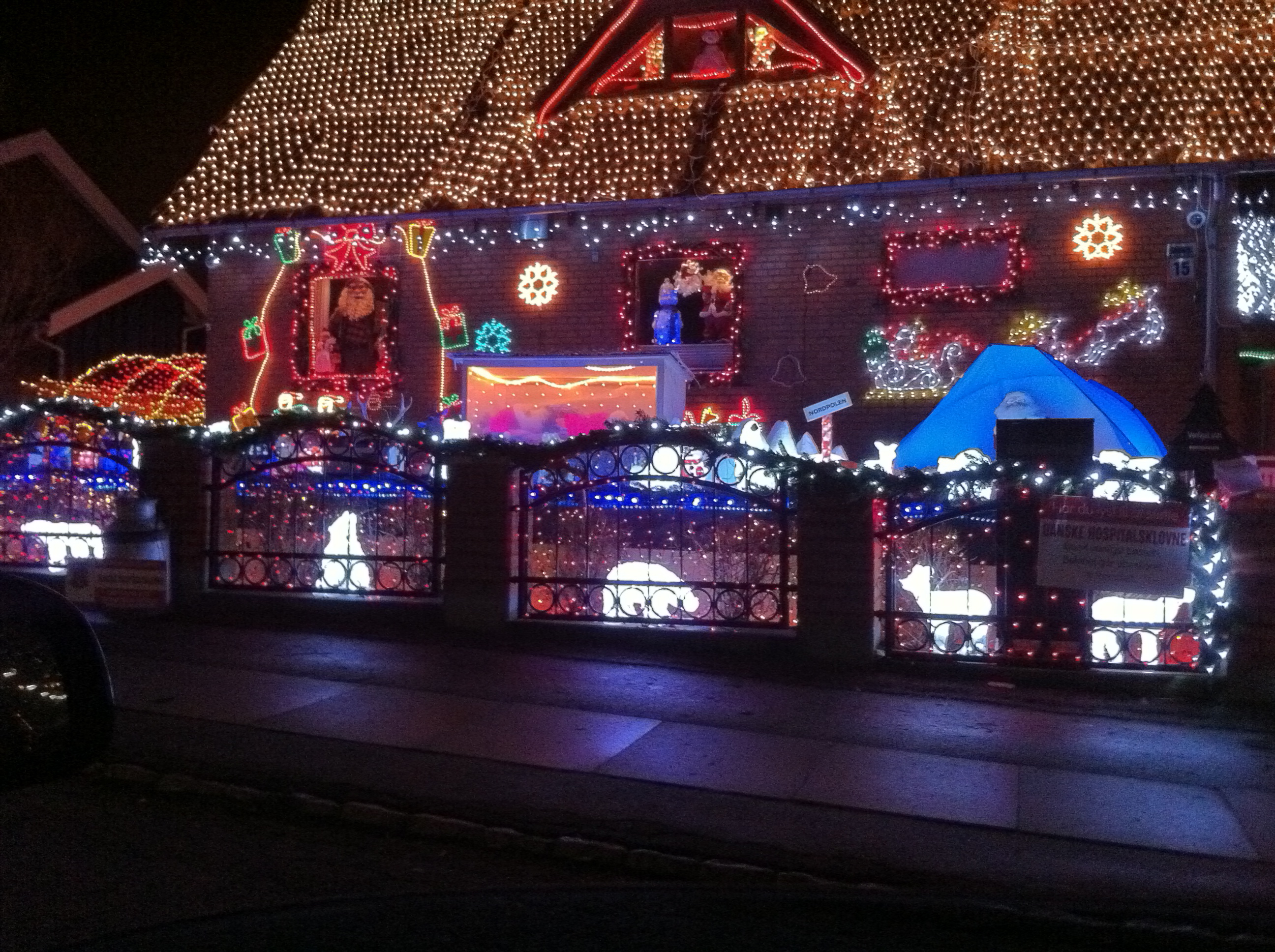 Ligesom man kan have juletræ uanset trosretning, kan man også pynte sit hus med lys. Man nøjes typisk ikke med at sætte lys på et lille grantræ i forhaven. Bl.a. fordi juletræet allerede er i stuen og ikke ude i forhaven, og grantræer på rod er ofte 20 meter høje. Normen er, at man sætter lys langs tagrenden. Og så kan man ellers tage det derfra helt op til at installere en ekstra fase på lysmasten, så der er strøm nok til at have pærer på alle træer, Santa med slæde og rensdyr på tagryggen, hjorte med nikkende hoveder på græsplænen, fem meter høje snemænd kontinuerligt oppustede af en kompressor, guirlander omkring alt, hvad man kan sætte guirlander om, lysende candy canes, og så lidt ekstra, hvor man synes der mangler noget.